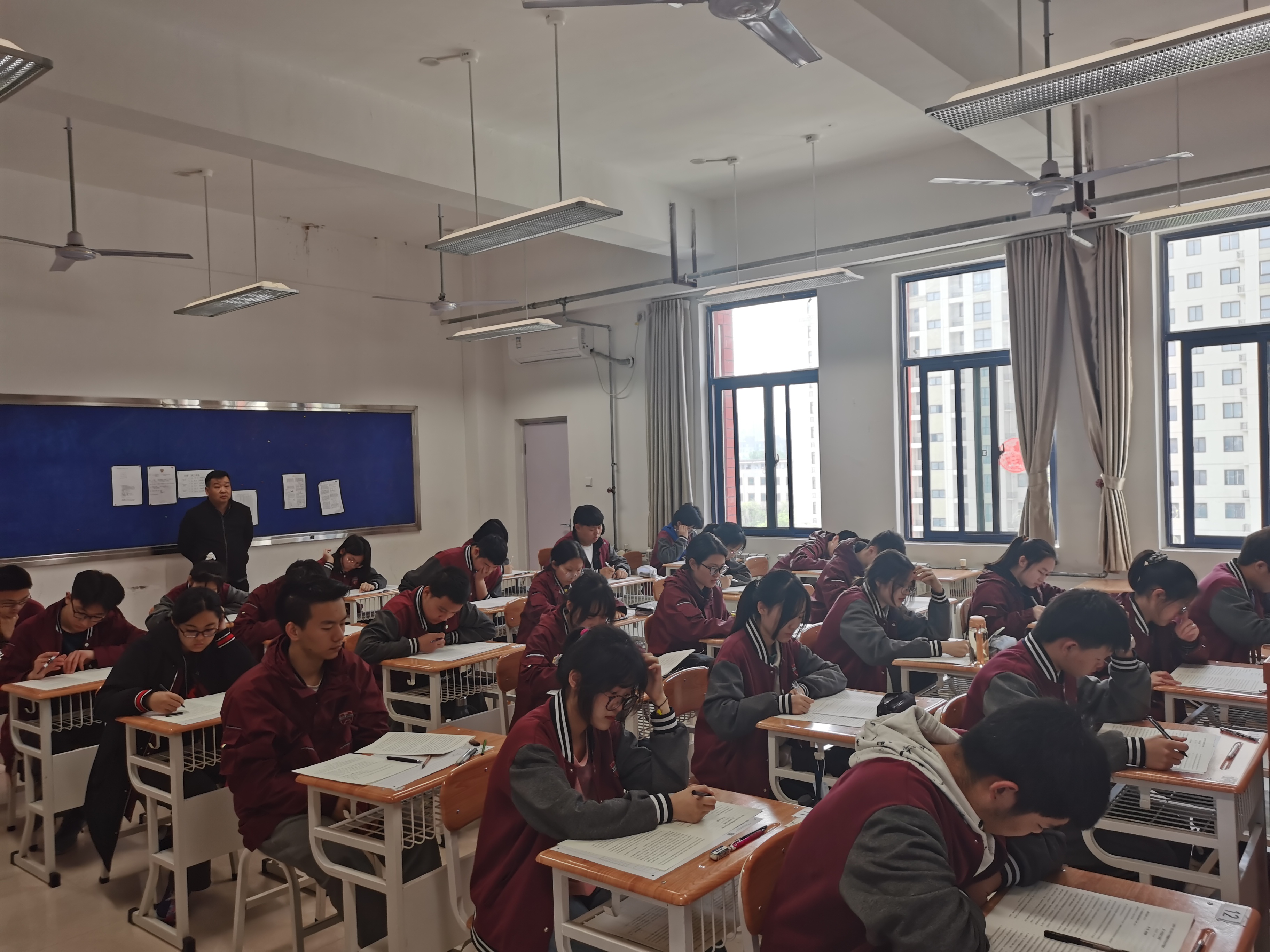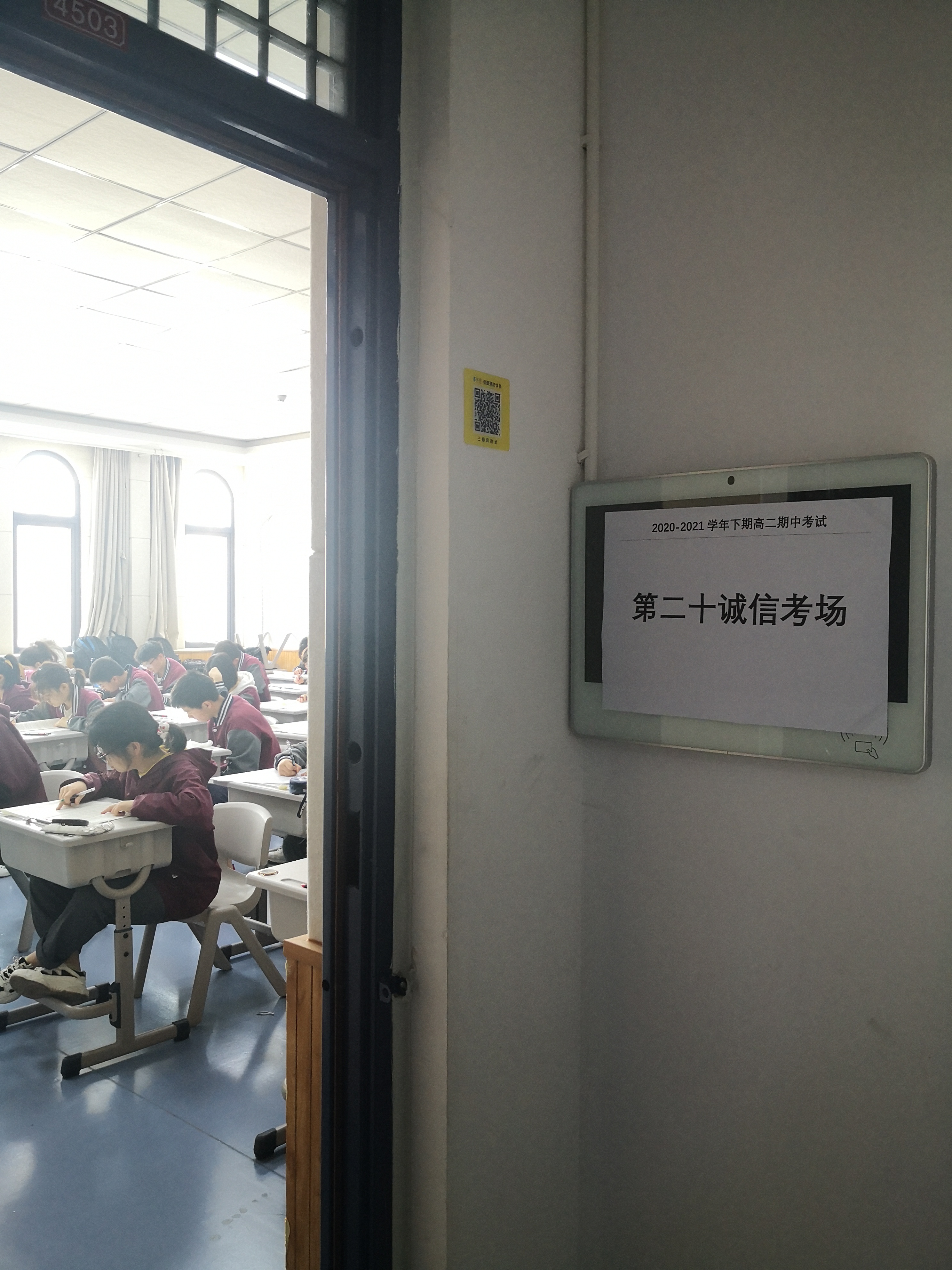 本次期中考试中,每个考场由一名家长监考员配合一名学校老师联合监考,高一高二年级总共启用家长监考员100余人。除此之外,每个年级设立一个诚信考场,每个考场36人,采取自愿报名的形式,除收发试卷外,全程无人监考。据悉,在本次考试中,学校无一人作弊。