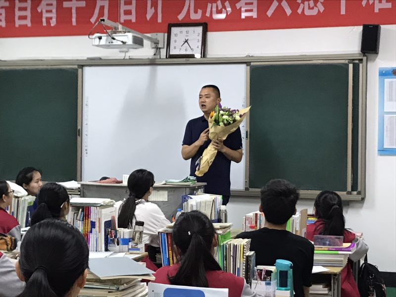 校长花束悄然来到 高三(2)班不失时机给学生鼓劲