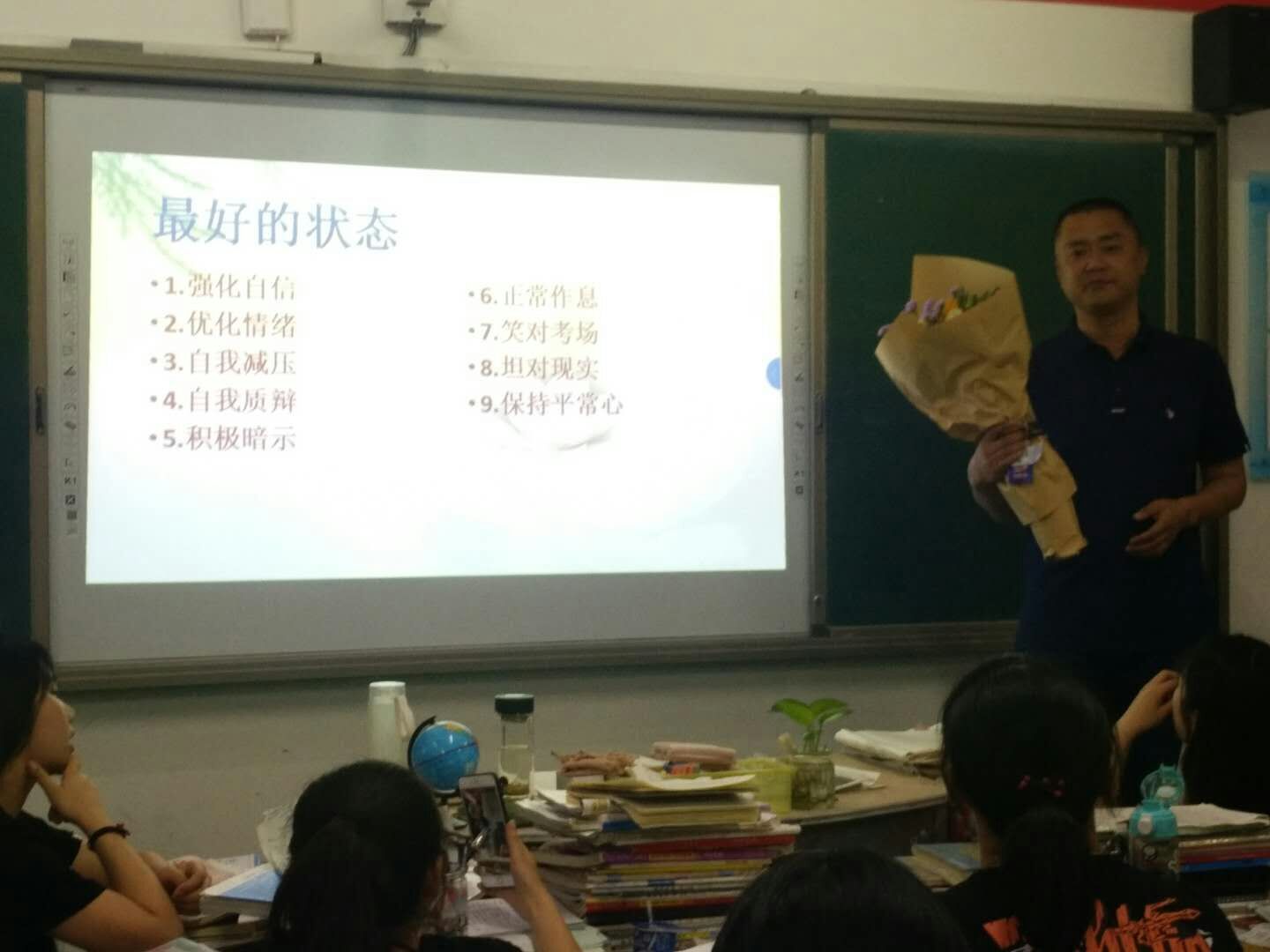 当各班班主任把校长的寄语读给大家或写在黑板上时,同学们倍受鼓舞,当倪校长把鲜花送到班长手中,并希望科学备考、科学作息时,三九班的同学们纷纷要求合影留念,班长说,一定会记住校长的殷切嘱托,调整好自己的心态,闻着花香前行。