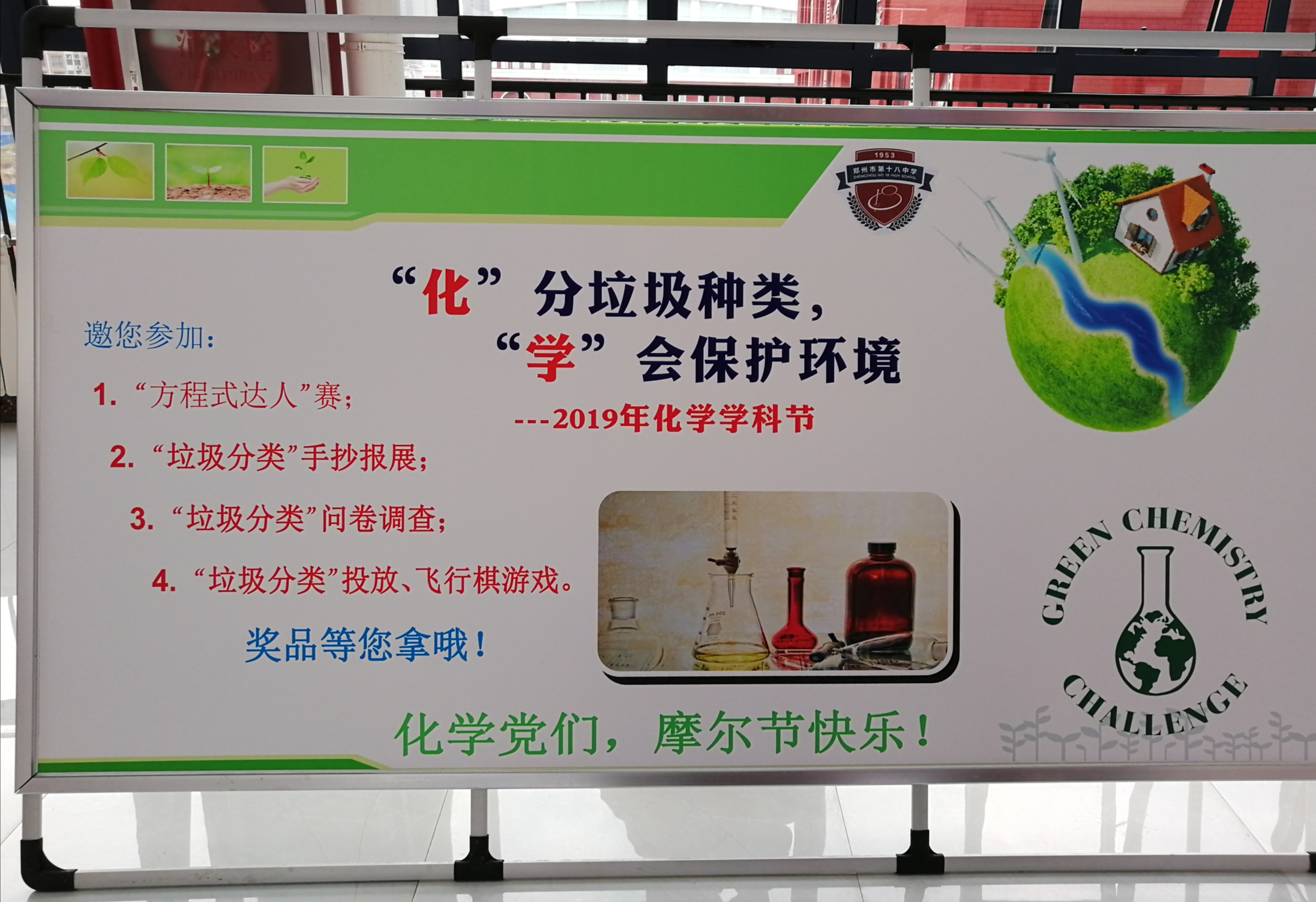 10月23日,郑州18中化学党们向往已久的摩尔日来到了,因阿伏伽德罗常数(6.02*1023)得名,以“垃圾分类”为主题的学科节活动成功开启。活动包括以下四个方面:“方程式达人”赛、“垃圾分类”手抄报、“垃圾分类”问卷调查和“垃圾分类”投放、飞行棋游戏。
