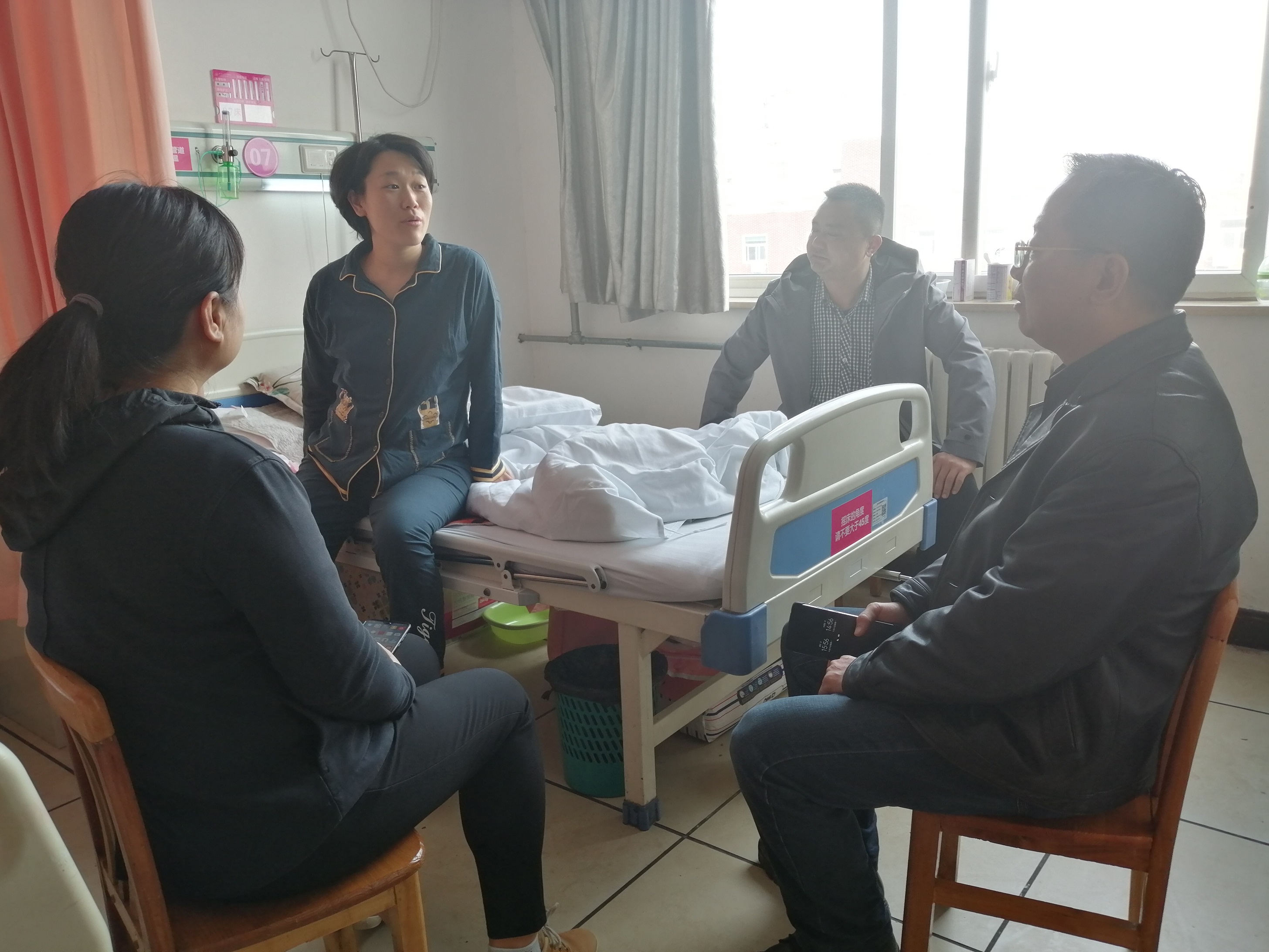 魏勇一行首先来到郑州市妇幼保健院秦岭路医院,看望葛巧红老师。葛老师看到“娘家人”来了,非常兴奋,她高兴地分享了自己的感受,身体恢复得很好,和她孕期科学的饮食习惯有很大的关系,如少吃米面,多吃高蛋白食物,整个孕期,体重增加了18斤,女儿出生7.1斤。工会主席张恺开心地和葛老师交流,询问她的身体恢复情况,叮嘱她注意身体,多休息。大家围着葛老师可爱的“小公主”,纷纷拿起手机拍照。党委书记魏勇在交谈中,对葛老师的精神给予了充分肯定。