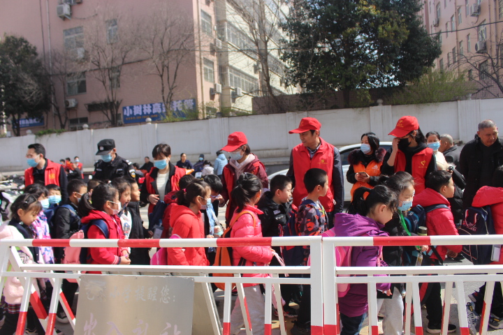 11:30,艺术小学一二年级放学,郑州18中的师生志愿者和社区志愿者分两队站立,帮助低年级学生有序的从学校门口分散到安全的学生接送点。