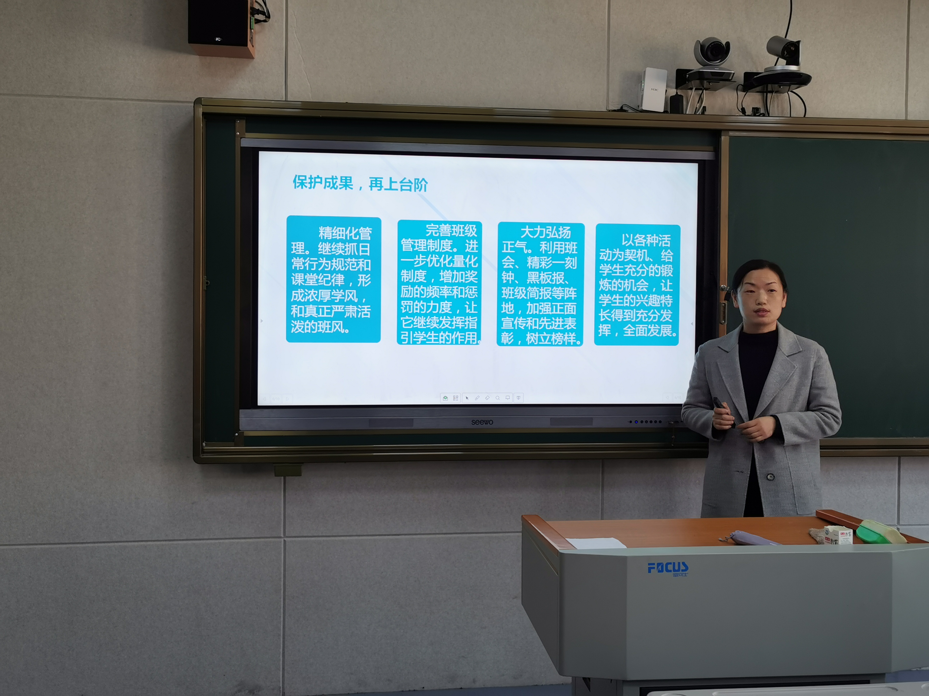 学校副校长倪海军在总结讲话中讲道:班主任是班级德育工作的主帅,要从思想上提高政治站位。希望各位班主任坚持“五育并举”,把转变学生思想,塑造学生心灵,矫正“三观”始终作为班级一切工作的灵魂。他要求班主任以学生为中心,把班集体的稳定、发展作为工作的重要目标。