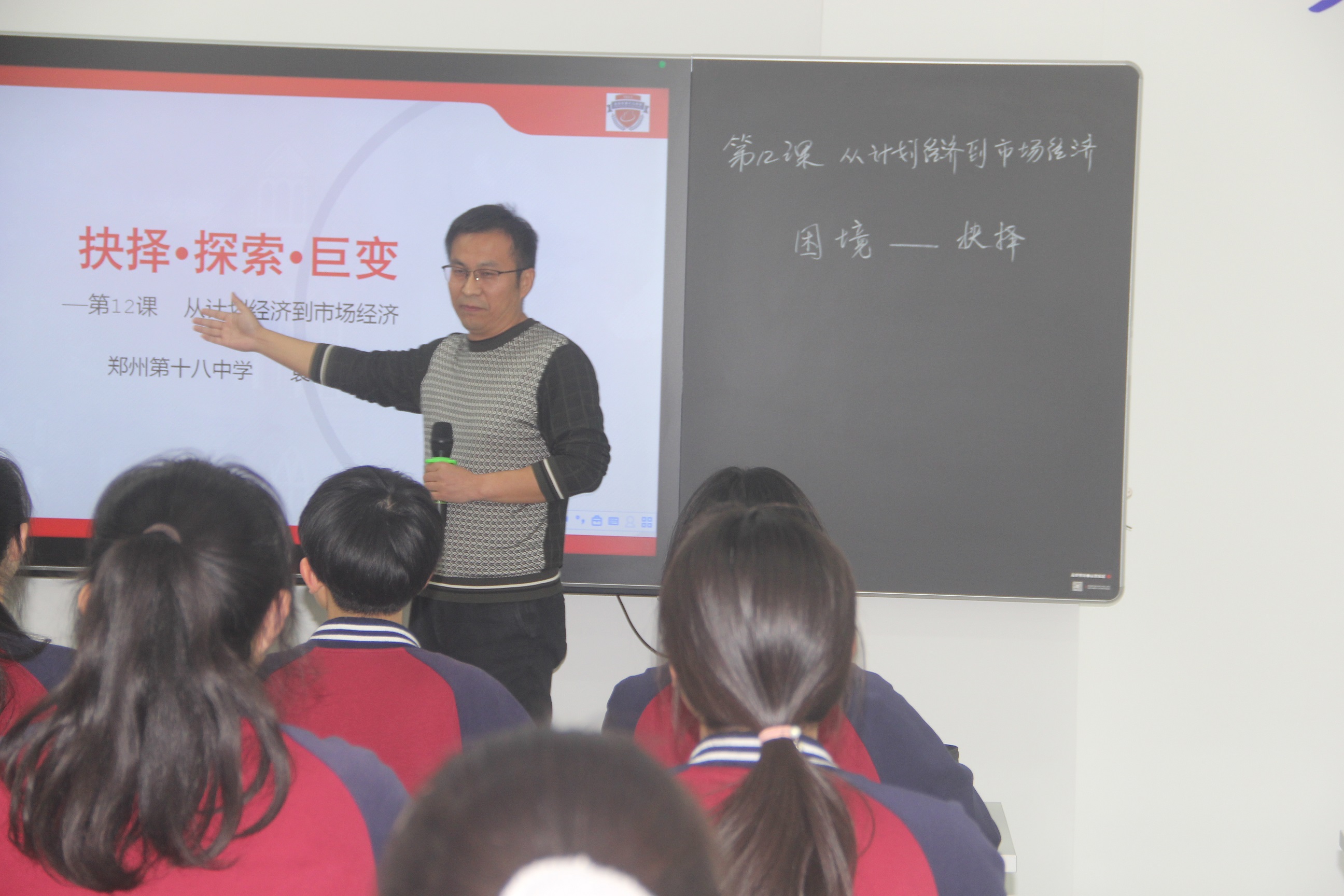 在展示课上,针对高中历史课《从计划经济到市场经济》,袁占领老师首先从中美阿拉斯加会议视频引入主题,并从史料佐证、时空观念及历史解释和家国情怀。课中,他选用十八大、十九大中的时效性材料,体现了以课标为中心的新高考理念。并将1978年以后十一届三中全会之后的经济体制改革放到了今天带去回溯,是一堂具有党课性质的历史课。他在注重在史料研读的基础上,让学生自由地说出观念,体现了新课改要求的以学生为中心的理念。