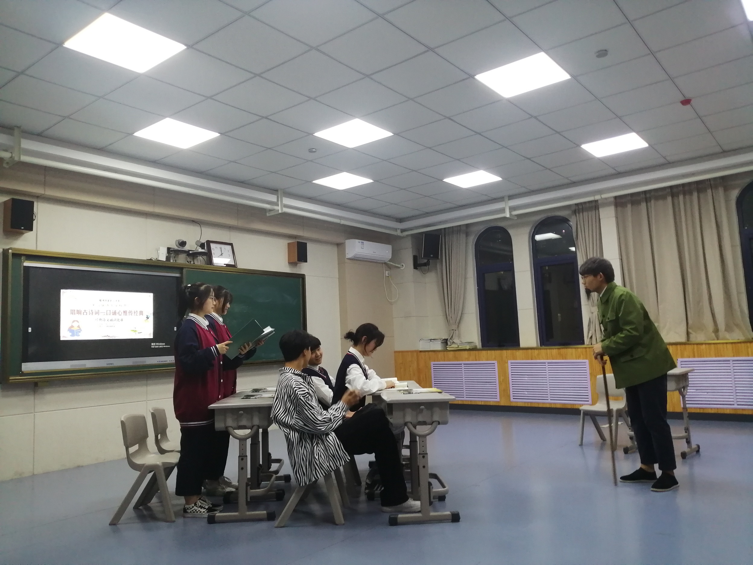 本届语文学科节,在学校的高度重视下,语文组经过前期精心策划,制定了详细的方案。经过班级初赛,各班推荐一到两个节目参加学校的比赛,要求从初高中语文课本中选择经典诗词作品,通过朗诵、传唱、表演等不同形式演绎。
