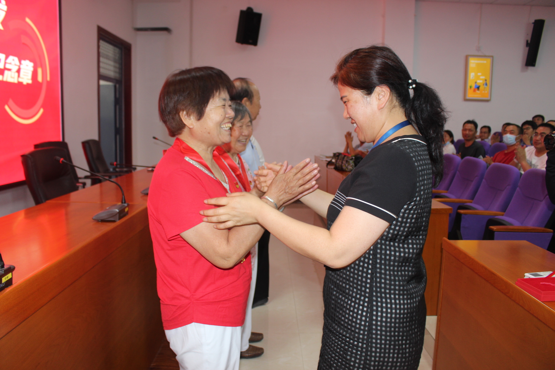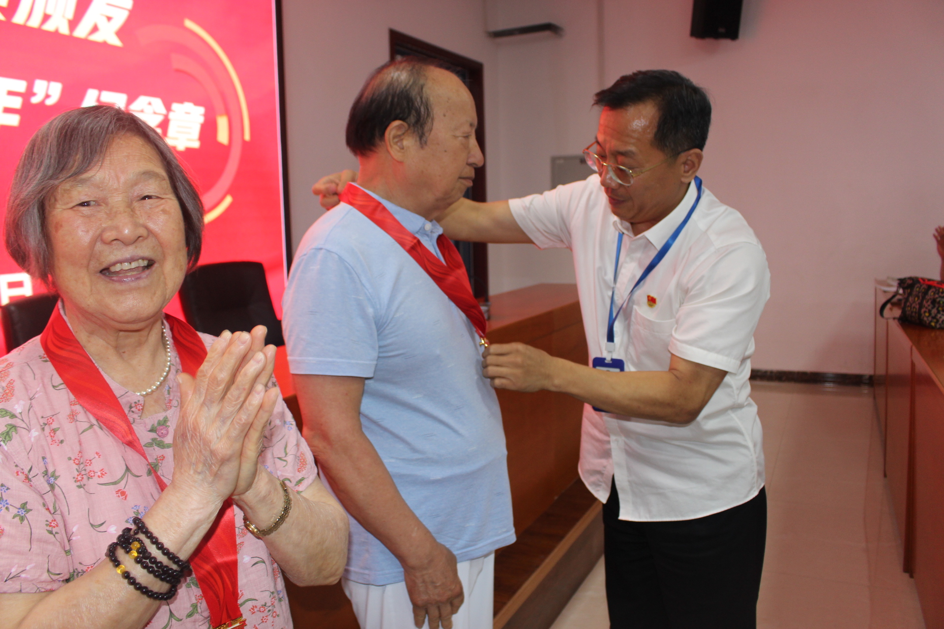 党委书记魏勇为50年党龄的退休教师马云学颁发纪念章