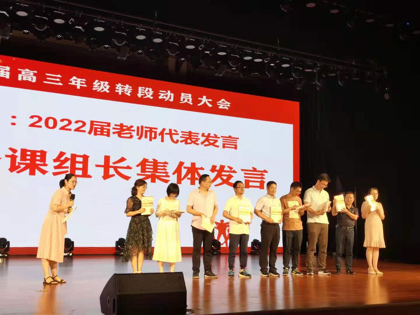 随后,2022届的高三师生接过接力棒。陈秋帆和孙金召给大家分享他们自己的学习经验和学习计划,并提出要有坚忍不拔的意志,有良好心态,方能不怕失败,迎难而上,勇攀高峰。高三全体备课组长也一一上台,用最质朴的语言给高三同学传授学科学习技巧,用真挚的情感为大家加油打气。学校将《高考试题汇编》送给备课组长,希望全体高三老师也能鼓足干劲,助力高考这一举动,更是将大会推向高潮。高三年级主任孙亚向同学们提出建议:要志存高远,竭尽全力,不断奋斗,努力拼搏,让胸怀与智慧在六月闪光!