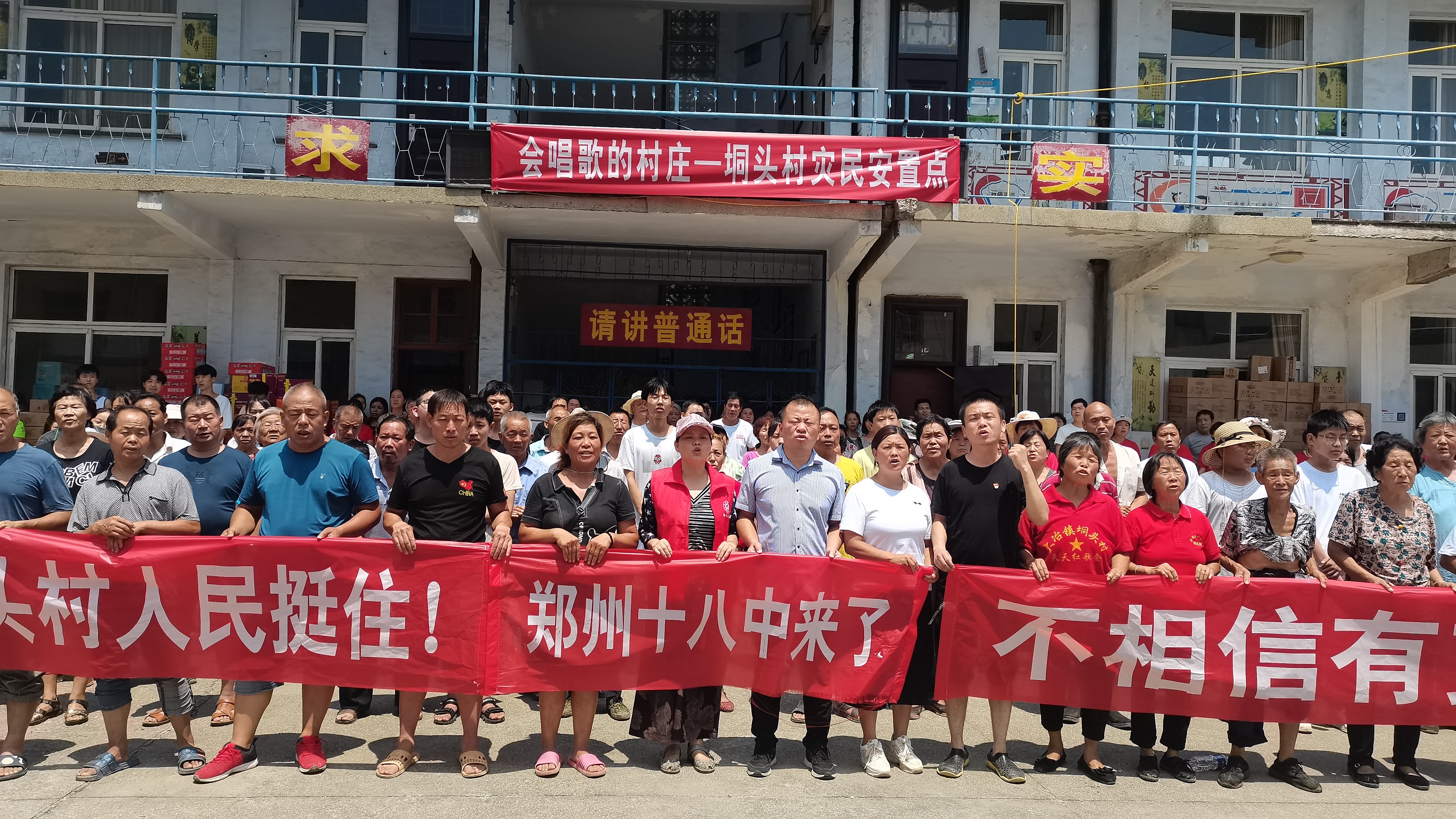 本次帮扶,郑州18中为垌头村带去矿泉水、方便面等大约三万元的赈灾物资。满载赈灾物资的车前面悬挂着“郑州十八中来了”,侧面悬挂着“郑州会唱歌的村庄——垌头村人民挺住”“不相信有克服不了的困难”,以此鼓励村民克服困难,重建家园。在安置点,郭鹏鼓励村民,事在人为,希望村民们能够齐心协力,一如既往地乐观、团结、坚强,用智慧和双手再建更美好的垌头村。在场很多村民都流下了感动的泪水。
