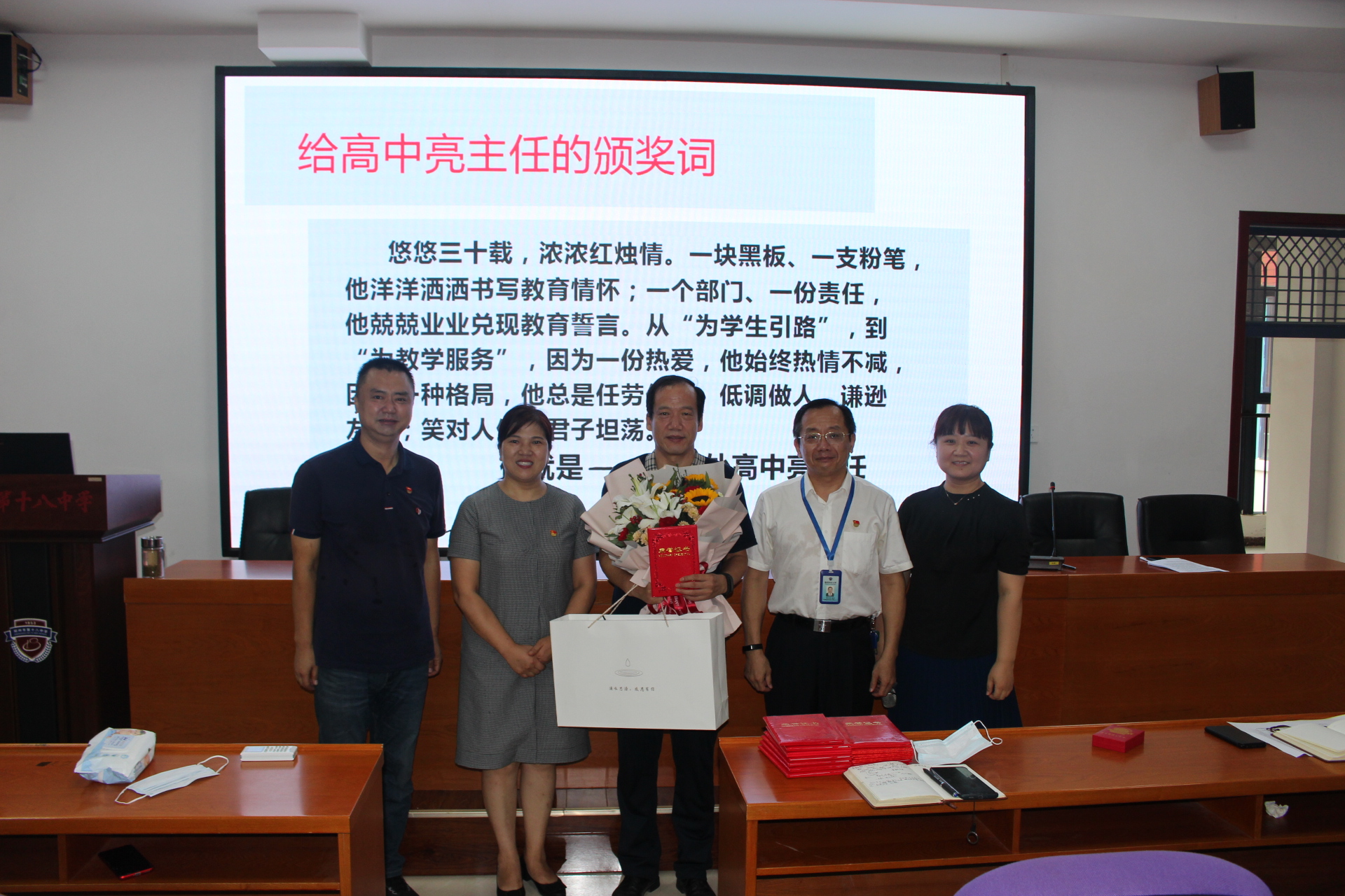 工会主席张恺带领全体教师向30年教龄的总务主任高中亮致敬,从为“学生的引路人”到为“学校的服务人”,他们是平凡的教师代表,在平凡的岗位上默默耕耘了三十年,坚守着最初的教育情怀,学校工会为他们写了颁奖词并颁发了奖章和荣誉证书。