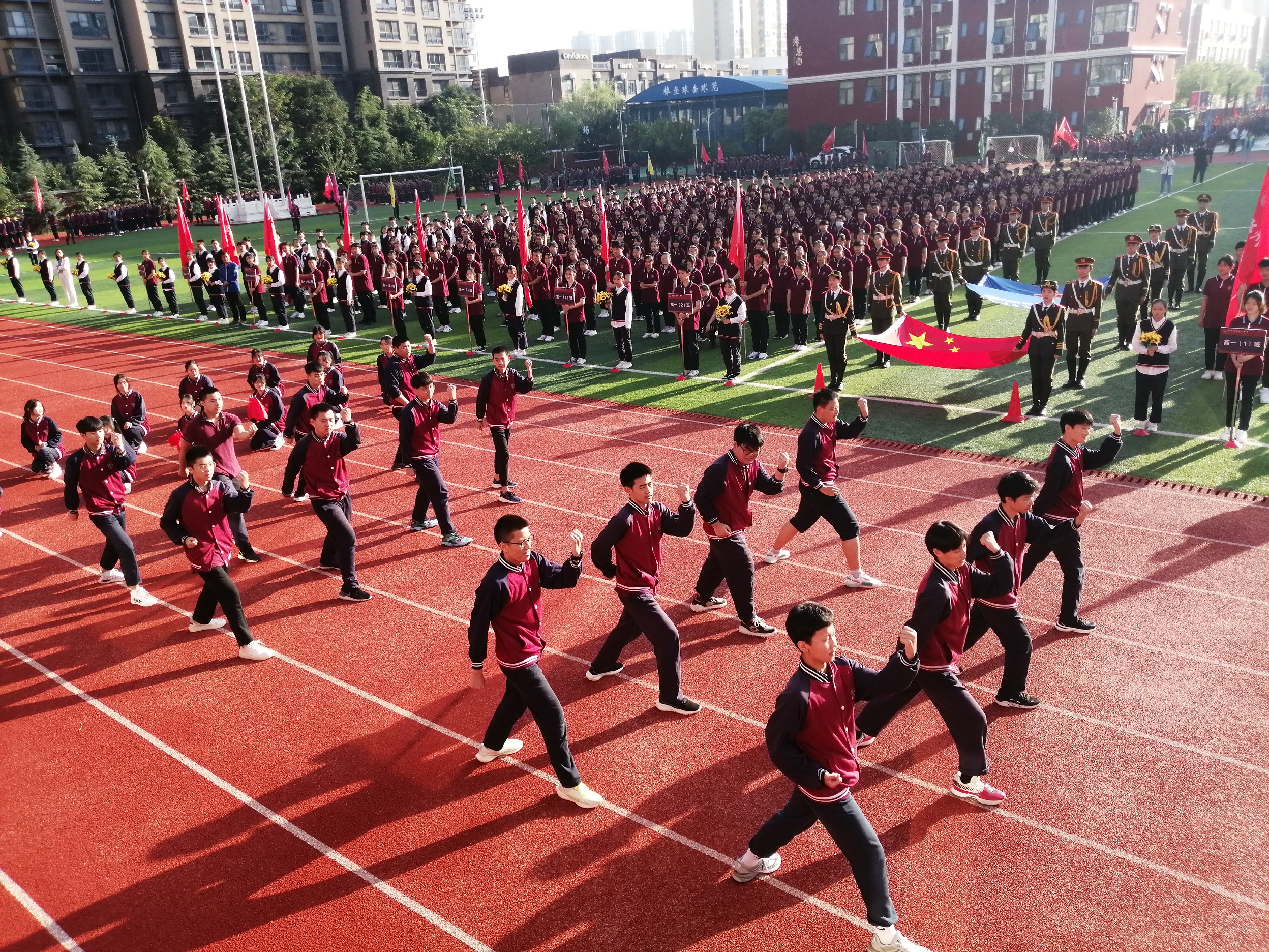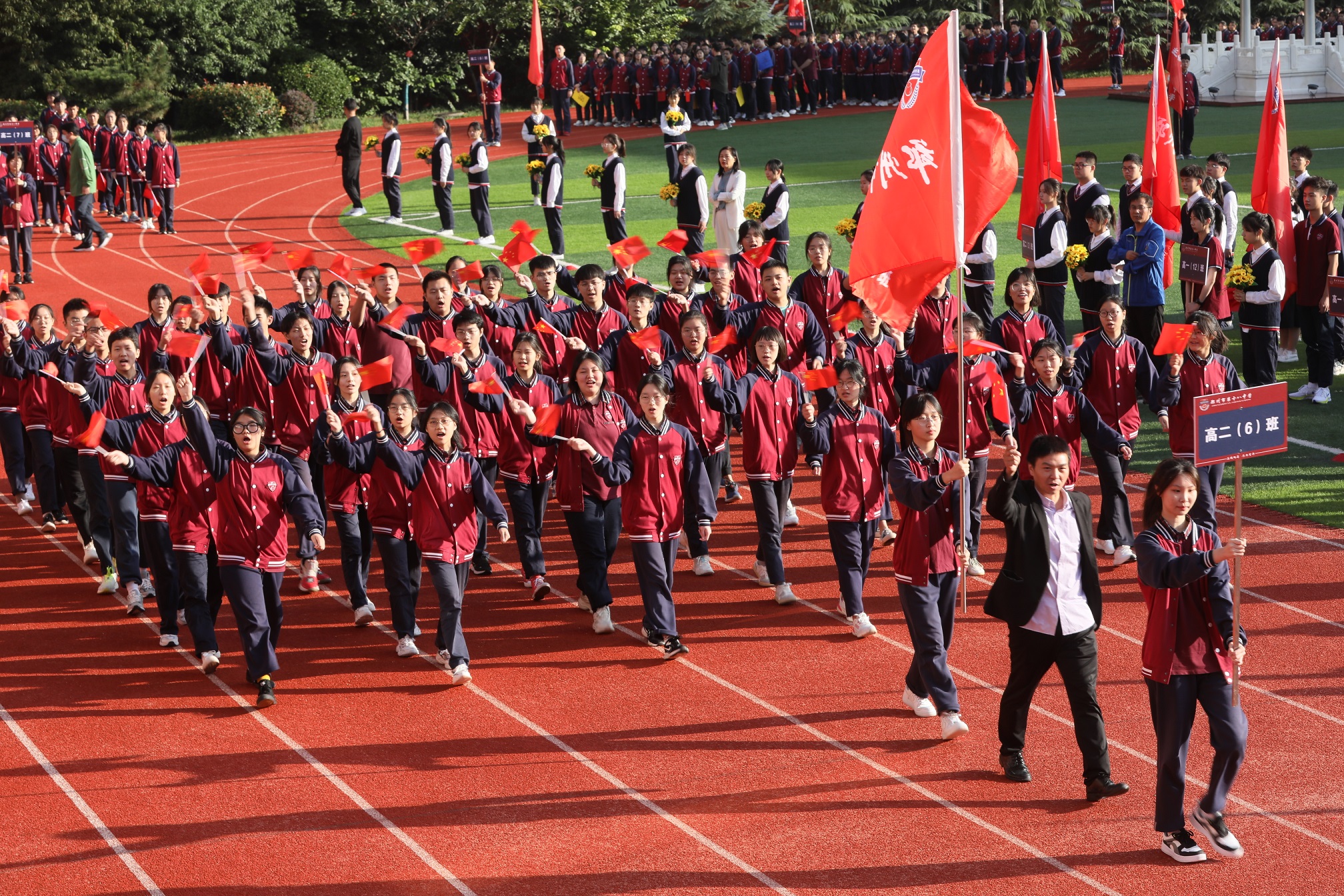 雄壮威武的国旗班举着国旗和校旗走在开幕式的最前面,阳光男生组成的彩旗队迈着整齐的步伐紧随其后,秀慧女生组成的花束队洋溢着青春的笑容走过主席台,教职工方队饱满的激情和洪亮的口号,赢得了同学们的阵阵掌声。