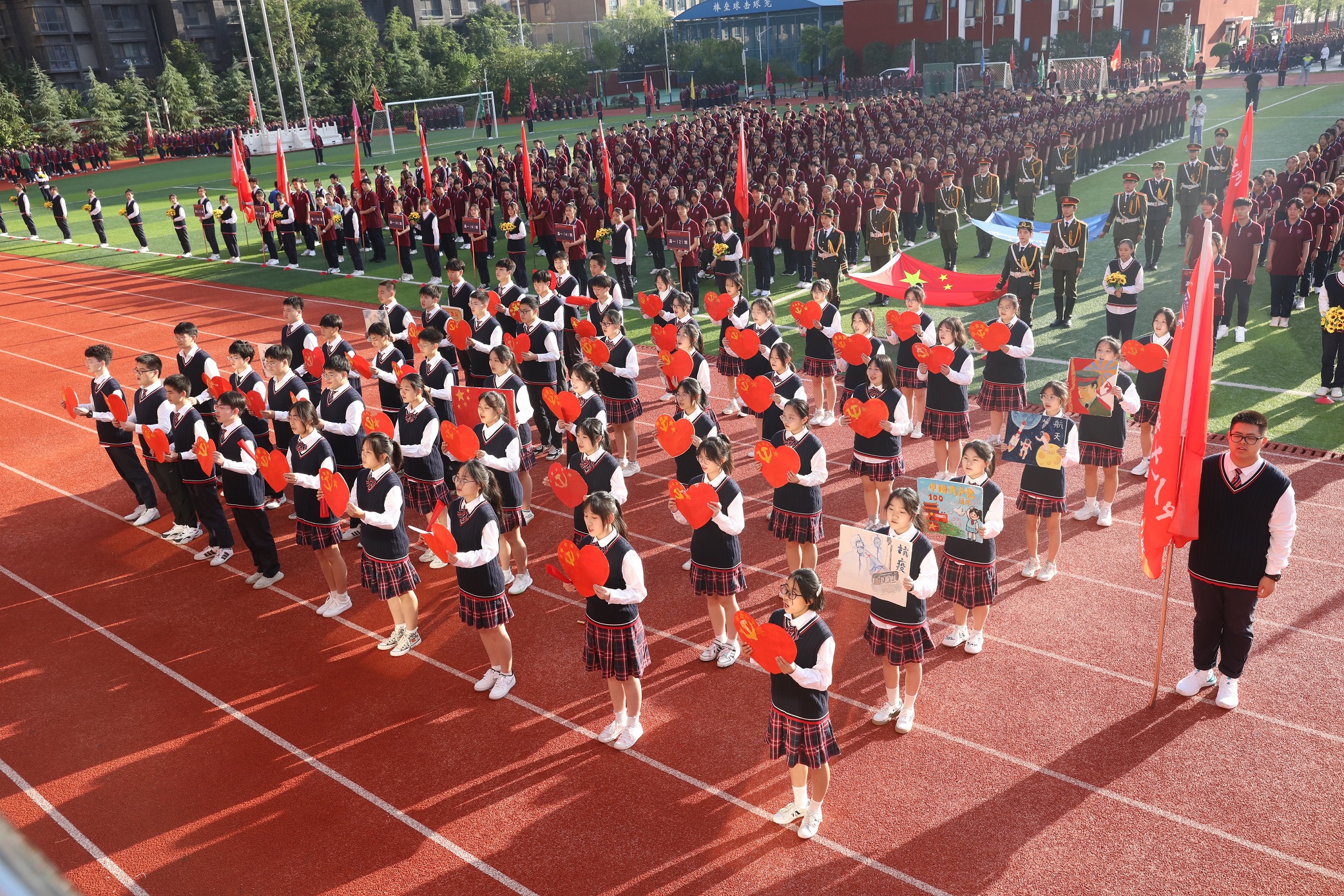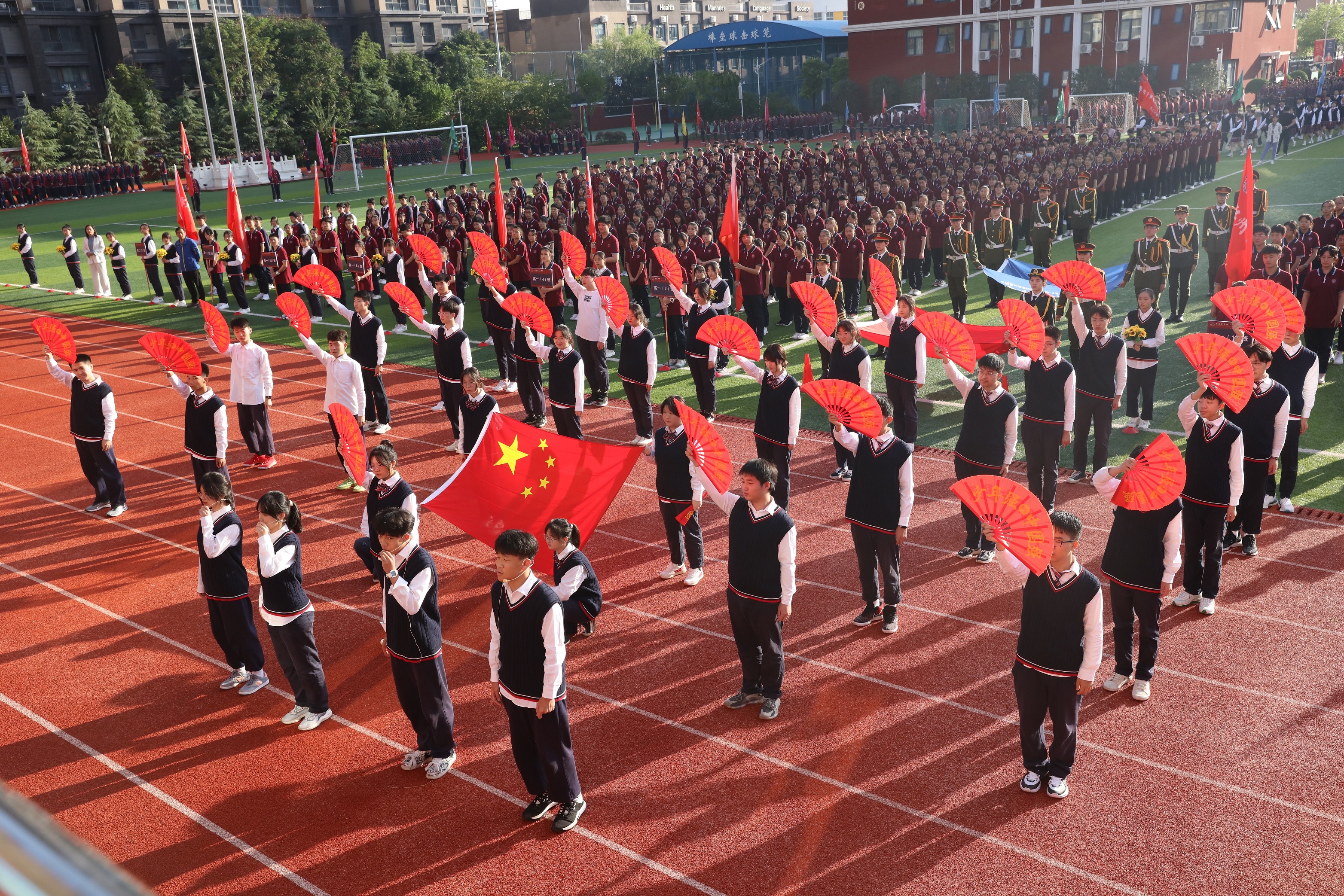 学生手持国旗,表达对祖国母亲生日的祝福。