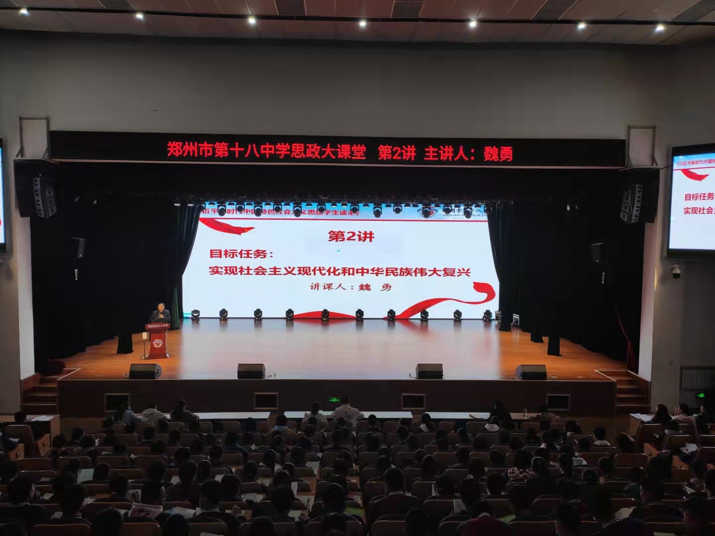 为学习宣传习近平新时代中国特色社会主义思想,用这一思想理论武装全党、教育师生,10月19日下午,郑州18中党委书记魏勇在学校报告厅为高一全体师生、学校党委委员及思政课教师上了一堂思政课,主讲内容是《习近平新时代中国特色社会主义思想学生读本》(以下简称“《读本》”)的第二讲《目标任务:实现社会主义现代化和中华民族伟大复兴》。