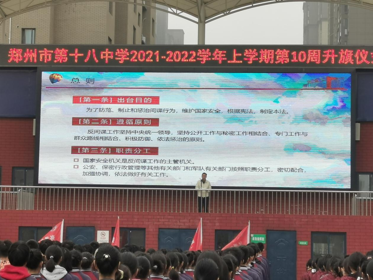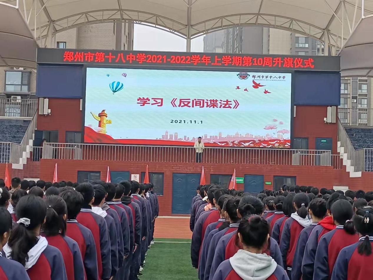 11月1日,在《反间谍法》颁布7周年之际,为贯彻郑州市教育局关于开展《反间谍法》宣传工作的通知,加强对学生进行国家安全教育,郑州18中成立了《反间谍法》宣传学习领导小组,并于2021年11月1日积极开展主题宣传教育活动,组织全体师生学习有关反间谍知识。